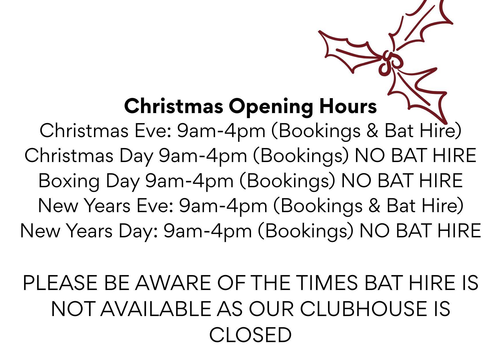 Christmas Eve: open 9am-4pm for bookings and bat hire